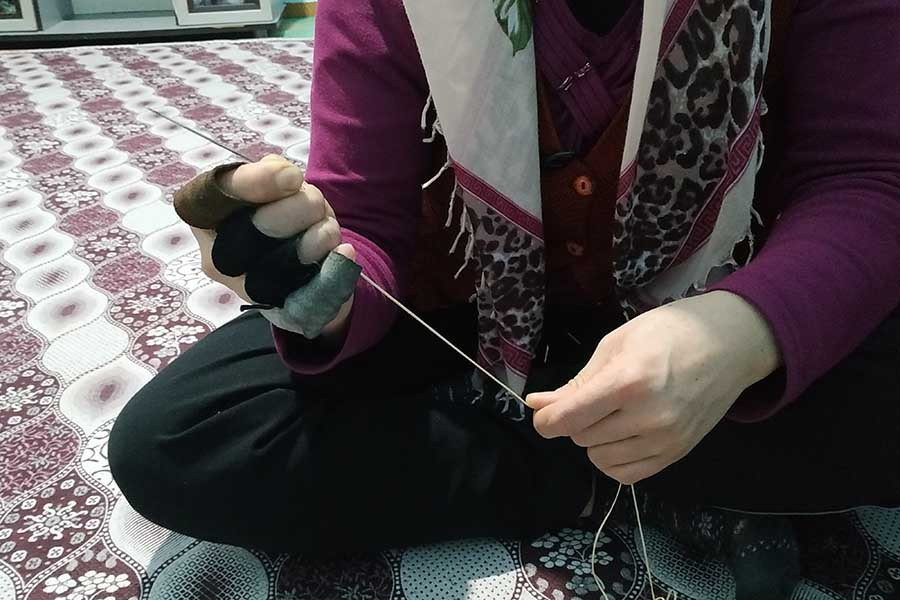 Ben bütün ekonomik zorluklara rağmen dört çocuğumu da okutuyorum. Eşim saya işçisi, 3 bin 200 lira alıyor. Ben de evde saya dikerek eşime destek olmaya çalışıyorum. Çocukları sabah okula bıraktıktan sonra işimi yapıyorum. Bir çift 4 lira, 14 saatte 5 çift yapabiliyorum o da 20 lira. Her an çalışıyorum, çok zorlanıyorum, naylon iplikle diktiğim için ellerim kesiliyor hep. Deri parçalarından yaptığım parmak koruyucuları takarak ellerimi korumaya çalışıyorum.