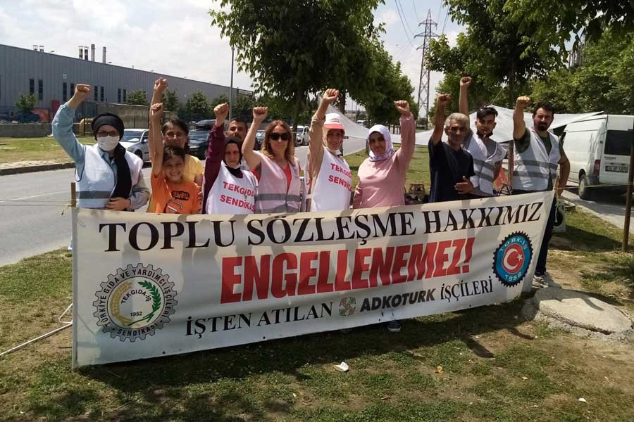 Çerkezköy OSB’de Endonezya ve Suriye sermayeli AdkoTurk 2014 yılından beri Tekgıda-İş sendikasında örgütlenmek istiyor. Uzun süren yargı sürecinden sonra Tekgıda-İş’in TİS yetkisi kesinleşti. Ama bu süre içinde Tekgıda-İş’in neredeyse hiçbir üyesi kalmamıştı. Tekgıda-İş bir taraftan yeniden üyelik çalışması yaparken diğer taraftan TİS sürecini sürdürmeye çalışıyor. AdkoTurk patronu ise hiçbir TİS toplantısına gelmediği gibi üye olduğunu tahmin ettiği 20 işçiyi Kod 29’dan işten attı. İşten atılan işçiler fabrika önündeki direnişlerini dört ay sürdürdükten sonra 23 Ağustos’ta greve çıktı. Patronların yasa tanımazlığı ve polisin açıktan patronlardan yana tutumu nedeni ile işçiler zorla fabrikaya sokulurken bütün engellemelere rağmen bir kısım işçi 13 gündür grevi kararlı bir şekilde sürdürüyor.