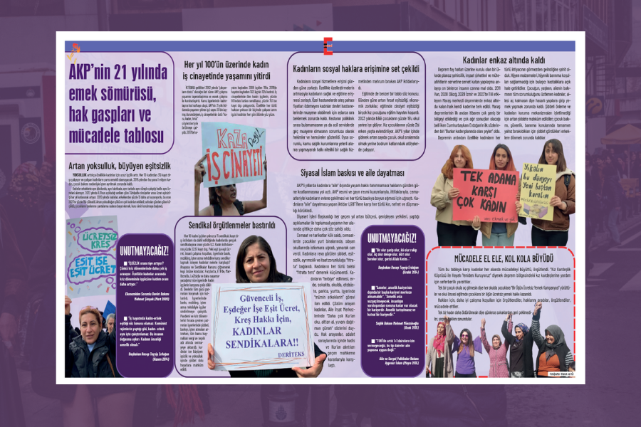İktidara geldikleri 2002 yılında “çalışanların dostu” olacağını ileri süren AKP, çalışma yaşamını taşeronlaştırma ve esnek çalışma ile kuralsızlaştırdı. Kamu işyerlerinde kadrolaşma had safhaya ulaştı. AKP’nin 21 yılık iktidarında yaşamını yitiren işçi sayısı 30 bini aşmış durumdayken, iş cinayetlerinin üstü “kaza, kader, fıtrat” söylemleriyle örtülmeye çalışıldı. 2017’de hayatını kaybeden 2006 işçiden 116’sı, 2018’de hayatını kaybeden 1923 işçinin 112’si kadındı. İş cinayetlerinde ölen kadın işçilerin, yüzde 90’ından fazlası sendikasız, yüzde 75’i ise kayıt dışı çalışıyordu. Özellikle her türlü haktan yoksun bir biçimde çalışan tarım işçisi kadınlar her gün ölümle yüz yüze.