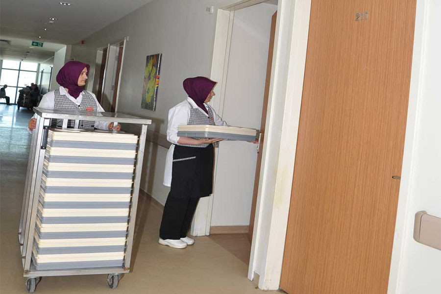 “Yemek geldi!!!” Koridora gelince sesleniyoruz; “Yemek geldi, kahvaltı geldi...” Bir an önce refakatçiler odalardan çıkıp hastalarının öğününü almaya gelsin de koşa koşa 3 servisin dağıtımını tamamlayabilelim.