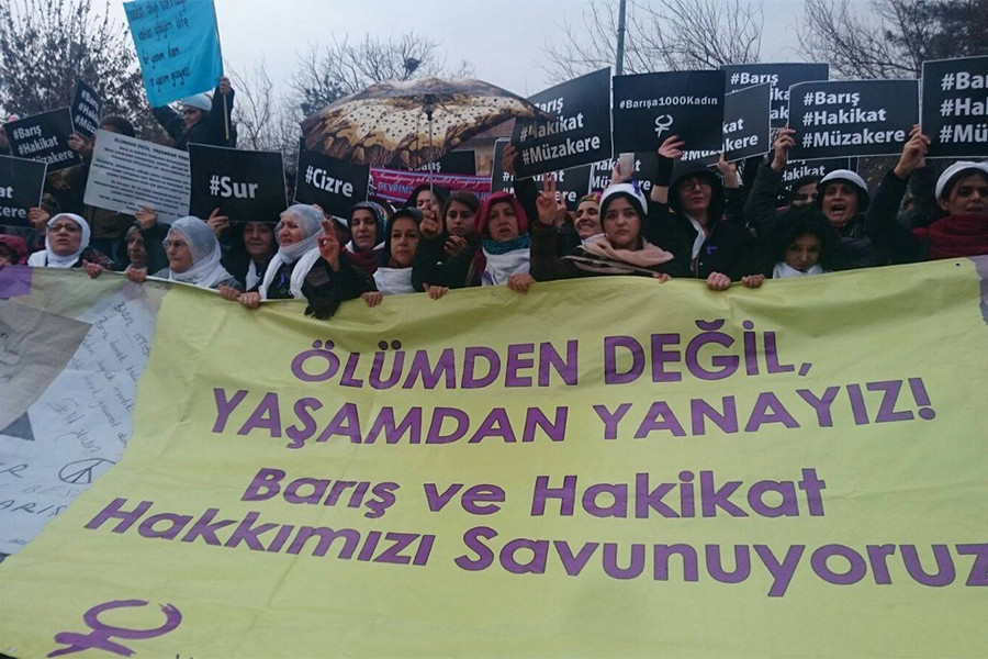 Bu ortaklaşma önemli. Çünkü o günlerde bu coğrafyada bir kadın, kızının cansız bedenini buzdolabında saklamak zorunda kalmış, çünkü sokağa çıkmanın yasak olduğu bir zamanda Cizre’de yaşıyor, kızını toprağa vermek için dahi evden çıkamıyor. Cemile Çağırga ve annesinden bahsediyoruz. Yine o günlerde sokakta vurulmuş bir kadın olan Taybet İnan’ın cansız bedeni bir hafta sokak ortasında kalıyor ve çocukları pencereden bakmak dışında bir şey yapamıyor, çünkü sokağa çıkmak yasaklanmış. Memleket öylesine terörize edilmiş, kutuplaşma hayatın her alanını o kadar çok kuşatmış ki barış talebini görünür kılan bir mücadeleyi, bir biçimiyle örgütleyebilmiş olmanın kıymeti harbiyesi her zamankinden daha büyük.