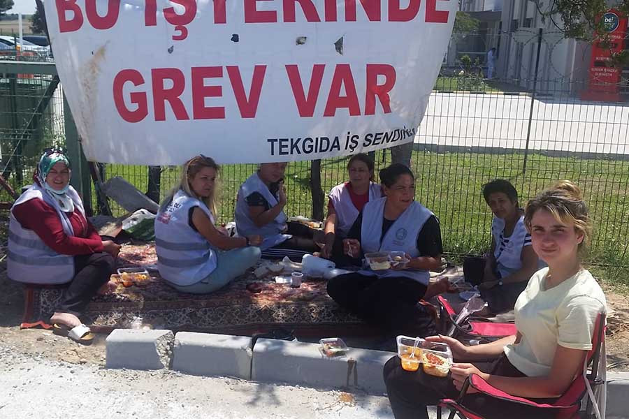 İlkay, oğlu 8 yaşındayken çalışmaya başlamış, oğlu şimdi 17 yaşında. Çocuğu küçükken, kimi zaman gece vardiyasına giderken çocuğun üzerine kapıyı kilitleyip işe gelmek zorunda olduğu günleri anlatırken gözleri doluyor. “7 yıldır yoğun ve tempolu koşullarda çalışıyorum. Haftada bir vardiyamızın dönmesi beni zorluyordu. Makine operatörüyüm ve seri şekilde hiç durmadan çalışıyoruz. Büyük kazanlar var ve o kazanların temizliğini de bize yaptırıyorlar. 3 ayda bir 500 lira iş güvenliği primi adı altında prim veriliyor. Ama o para da sürekli kesintiye uğruyor. İzin, rapor kullanmışsak oradan kesiyorlar, ya da yetiştiremediğimiz üretim sayımız varsa öyle kesintiye uğruyor. İçerde biri iş kazası geçirdi, onun makinası o sırada durdu. Onun üretim eksiği tüm işçilerden kesiliyordu, elimizde kalan 100 lira oluyordu genelde. Yıllık zamlarımızda rapor kullandığımız sayıya bakılıyor. Rapor kullandığımız için zammımız kesiliyor. 8 saat zor koşullarda çalışıyoruz ve daha iyi koşullarda çalışabilmek için günlerdir burada mücadeledeyiz. İsteriz ki çalışan üreten her kadın hakkını almak için mücadele etsin bizler gibi.”