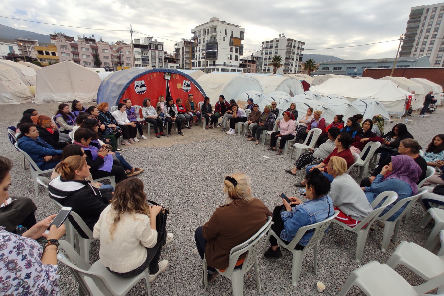 Evet, insanların öncelikli ihtiyaçları karşılansa da çocuklar için oyun çadırı kurmak, kadınlar için özel bir alan oluşturmak istiyorduk, depremzedelerin yaşadıkları travmadan çıkmasını sağlayacak sosyal etkinlikler yapmak niyetindeydik. Kadınlarla sohbet etmek istiyoruz, sandalye yok… Film gösterimi için internet yok, elektrik yok, yok yok yani. Dayanışma ile hepsini çözdük. İki adet çocuk çadırını, daha sonrasında Ekmek ve Gül çadırını kurduk, kadınlarla 8 Mart toplantısı yaptık ve çadırkentteki kadınların katılımıyla 8 Mart Dünya Emekçi Kadınlar Günü’nü kutladık.