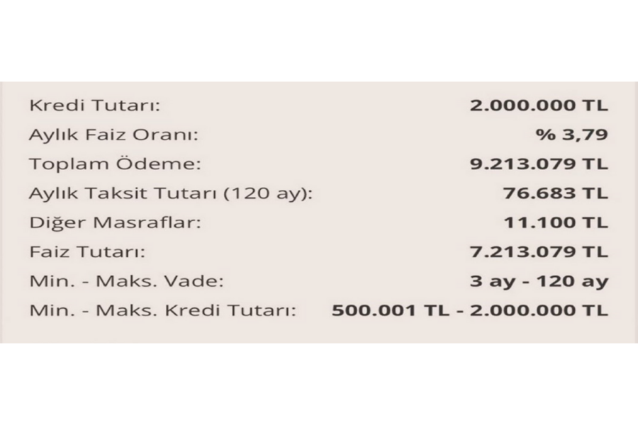 Tabloda gördüğünüz gibi 2 milyon lira kredi çekince 10 yılda toplam 9 milyon 213 bin lira ödeyeceksiniz. Yani aylık ödemeniz “76 bin 683 lira” tabloda rakamlar gayet net yazılmış.