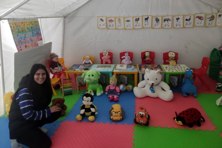 Ekibimizde her meslekten arkadaşımız vardı ama konu çocuk olunca eğitimci, çocuk gelişimci ve psikolog özellikle olmalı diye düşündük. Çocukların ihtiyaç listesini çıkardık, listemizi her bir arkadaşımız sosyal medyada ve gruplarda paylaştı. Çevremizdeki birçok insanı bu proje heyecanlandırmıştı. Çok güzel dönüşler aldık, çok çabuk bir şekilde toplanma alanına oyuncaklar, boya kalemleri, bebek bezleri, mamalar, kırtasiye malzemeleri gelmeye başladı. Kadınlı erkekli herkes bir şey getiriyordu ama kadınların bu süreci daha fazla sahiplendiğine şahit olduk. Gerek el emekleriyle gerek parayla aldıkları ürünleri özenle getirdiler. Etrafındaki her kadını katmayı kendilerine görev edindiler. Çevremizdeki herkes bu kampanya için maddi yardımda bulundu. Erkek arkadaşlarımız da çadırlardan masalara kadar alınacak her şey için hem kaliteli hem ucuz alacakları yerleri özenle seçip pazar araştırması yapıp daha çok çocuğa ulaştırmak üzere malzemeleri aldılar. Ama en güzeli de çocukların kendi arkadaşları için en sevdikleri oyuncakları paketleyip üzerlerine notlar iliştirmesiydi. Çocuklar kampanyaya hem umut oldular hem de destek. Bir haftalık sistematik ve örgütlü çalışmamızın sonunda çocuklarımıza iki çadır ve tam teşekküllü bir oyun, sanat ve öğretici alanı yaratmış olduk. Hep birlikte her şeyi istifledik, paketledik ve koliledik. Son olarak da tıra yükleyip yola çıkmasını sağladık. Çok içimize sinen bir dayanışma oldu. Dayanışmaya katılan bütün arkadaşlarımız için hem uyumlu hem de öğretici bir proje oldu. Yeryüzü çocuklarımıza korku ve acı getirdi ama gökyüzü hepimize umut olsun istedik. Bu projenin birçok kişiye örnek olacağını bilmek bizim mükafatımız olacaktı. Dayanışma duygusunun bize güç verdiğini hep birlikte hissettik. Dayanışma yaşatır. Bizimle olan herkesin eline, emeğine sağlık.