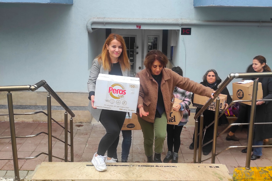 kuru gıda malzemeleri topladı. İlk etapta 27 koli malzeme toplandı ve deprem bölgesine ulaştırılmak üzere yola koyuldu. Kadın eğitimciler ve onlarla birlikte hareket eden kadın emekçiler sadece malzeme toplamıyor bu kampanyanın sürdürülmesi için emekçi kadınların mahallelerde örgütlerinin kurulmasını da örgütlüyorlar. 10 kadın eğitimci ve işçi kadın ayrıca Ataşehir Belediyesi bünyesinde oluşturulan deprem koordinasyon ve AKKOM merkezlerindeki toplanan malzemelerin TIR’lara yüklenmesi, taşınması esnasında da aktif görev alıyorlar.