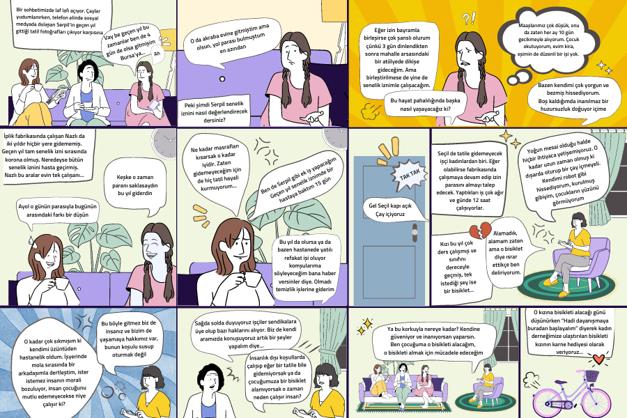 Eğer izin bayramla birleşirse çok şanslı sayacak kendini çünkü 3 gün dinlendikten sonra mahalle arsasındaki bir atölyede dikiş dikecek. Ama birleştirilmese de yine de senelik izninde çalışacak. “Bu hayat pahalılığında başka nasıl yaşayacağız ki?” diyor. “Maaşlarımız çok düşük, onu da zaten her ay 10 gün gecikmeyle alıyorum. Çocuk okutuyorum, evim kira, eşimin de düzenli bir işi yok. Bazen kendimi çok yorgun ve bezmiş hissediyorum. Boş kaldığımda inanılmaz bir huzursuzluk doğuyor içime” diye konuşuyor. Çocuğunu üniversite sınavına götürdüğü gün evden su almayı unutmuş, diyor ki “Dışarıda su olmuş 4 TL çocuğa aldım, kendim eve dönünceye kadar susuz kaldım. Yani anlayacağız bırakın bir tatile gitmeyi yarının kuru ekmeğini düşünüyorum sadece. Bu paniği de en çok maaş gecikince yaşıyorum. Şimdi bu parasızlıkla ben nasıl güçlü kalayım? Birlikte çalıştığım tüm kadınlar neredeyse aynı sorunları yaşıyor. Bize bir tatili bile çok gören bu düzende, işçiye gülmeyi haram ettiler...”