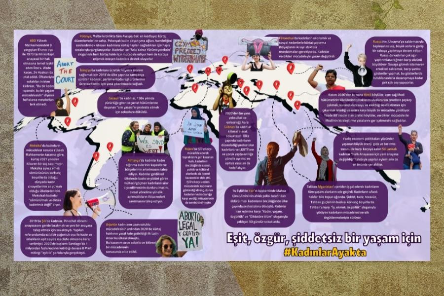 Meksika’da kadınların mücadelesi sonucu Yüksek Mahkemenin kararına göre, kürtaj 2021 yılından itibaren bir suç sayılmıyor. Sağcı politikacılara ve muhafazakâr doktorlara rağmen, kürtaj ve kadınların kendi bedenleri üzerindeki hakları Meksika’nın 32 eyaletinde yavaş yavaş tanınmaya başlandı. Meksika ayrıca emek sömürüsünün korkunç boyutlarda olduğu, dünyada kadın cinayetlerinin en yüksek olduğu ülkelerden biri. Meksikalı kadınlar “sömürülmek ve ölmek kaderimiz değil” diyor.