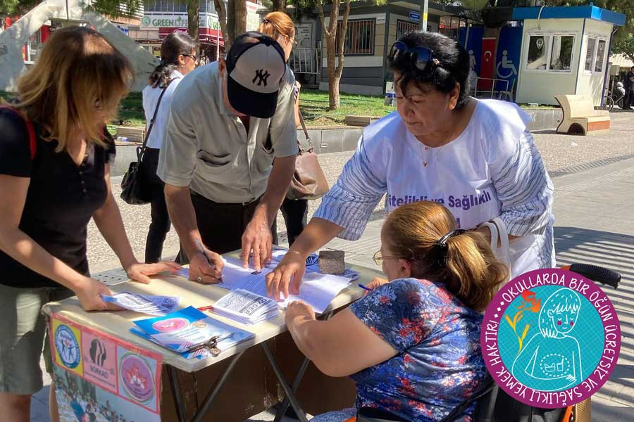 Uzun zamandır talep edilen, ancak mayıs ayında Kocaeli Ekmek ve Gül Kadın Dayanışma Derneğinin başlattığı, eylül ayı başında da Ekmek ve Gül’ün çağrısıyla pek çok kentte farklı kadın örgütlerinin, veli derneklerinin, çeşitli sendikaların, mahalle inisiyatiflerinin katılımıyla büyüyen “Okullarda bir öğün ücretsiz ve sağlıklı yemek her çocuğun hakkıdır” çalışması dalga dalga ülke geneline yayılıyor. Öğrenci Velileri Dayanışma Derneğinin (ÖVDER) varlık nedeni olan, “Çocuklarımızın sağlıklı beslenmesi eğitim hakkının ayrılmaz bir parçasıdır” ilkesinden hareketle biz de kampanyayı İzmir’de ete kemiğe büründürdük. Bornova Kadın Dayanışma Derneği (BORKAD), Buca Evka-1 Kadın Kültür Dayanışma Evi Derneği (BEKEV) ile birlikte çalışmalara başlandı.