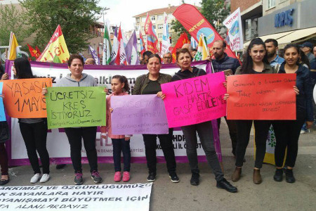 1 Mayıs alanında kadınların talepleri: 8 saat iş günü, sendika, sigorta istiyoruz. Kıdem tazminatımızı da, hayallerimizi de, haklarımızı da vermeyeceğiz.