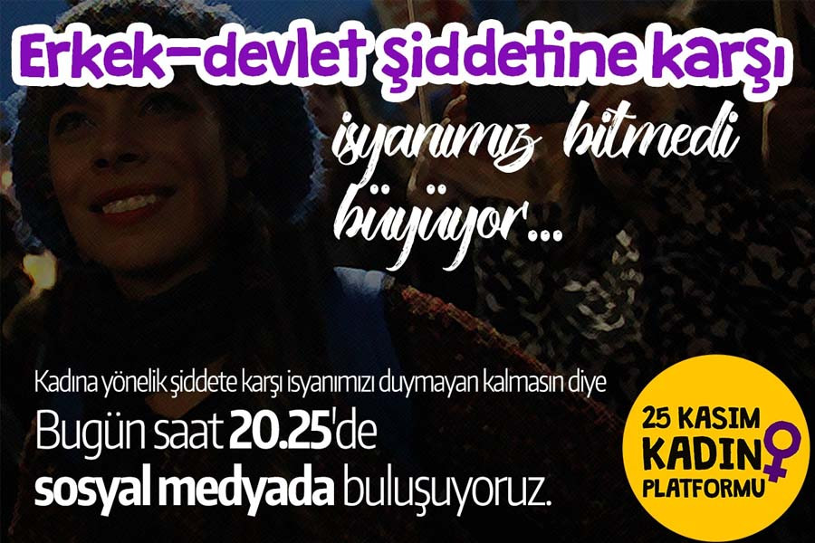 25 Kasım Kadın Platformu "Şiddetsiz bir hayat için mücadele çağrımızı, şiddete karşı isyanımızı duymayan kalmasın diye buluşuyoruz" diyerek 25 Kasım yaklaşırken bugün saat 20.25’de sosyal medyada hashtag eyleminde buluşmaya çağırdı.