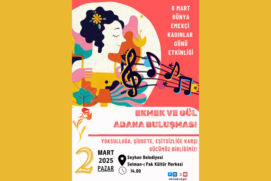 Adana Ekmek ve Gül Grubu, 8 Mart'a giderken yoksulluğa, şiddete, eşitsizliğe karşı kadınları buluşmaya, mücadeleyi birlikte tartışmaya çağırıyor.