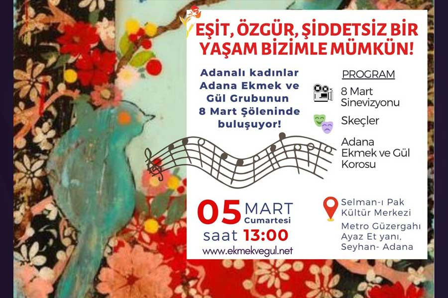 ‘Eşit, özgür, şiddetsiz bir yaşam bizimle mümkün’ diyen Adana Ekmek ve Gül Grubu, Adanalı tüm kadınları 8 Mart şölenine çağırıyor.