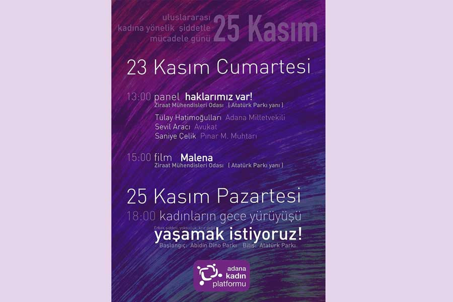 Adana Kadın Platformu bir dizi etkinlikle 25 Kasım’a gidiyor. 23 Kasım’da panel yapacak olan kadınlar 25 Kasım’da ise gece yürüyüşüne katılacak.