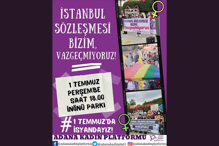 Adana Kadın Platformu, 'İstanbul Sözleşmesi bizim, vazgeçmiyoruz' sözünü büyütmek için 1 Temmuz 18.00'de İnönü Parkı'na çağırıyor.