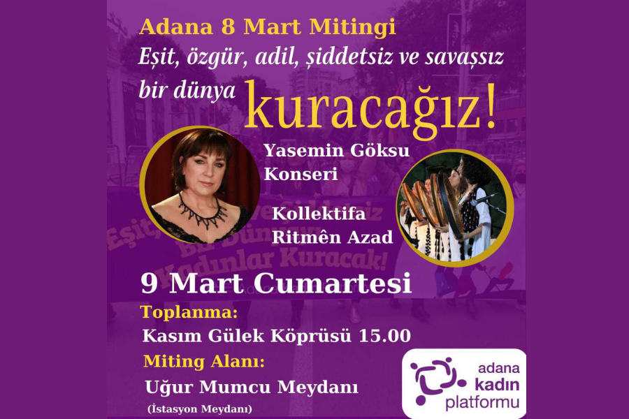Kasım Gülek Köprüsü'nde toplanacak olan kadınlar, sonrasında Uğur Mumcu Meydanı'na yürüyerek mitingi gerçekleştirecek. Mitingde Yasemin Göksu ve Kollektifa Ritmên Azad sahne alacak.