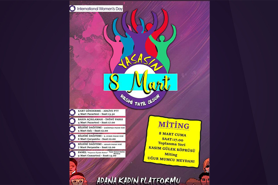 Adana Kadın Platformu bu yıl 8 Mart Dünya Emekçi Kadınlar Gününe hafta boyu düzenleyeceği etkinliklerle hazırlanıyor. Platform, 8 Mart Cuma günü de Adana’daki tüm kadınları 17.00’de Uğur Mumcu Meydanında yapılacak eyleme çağırıyor.