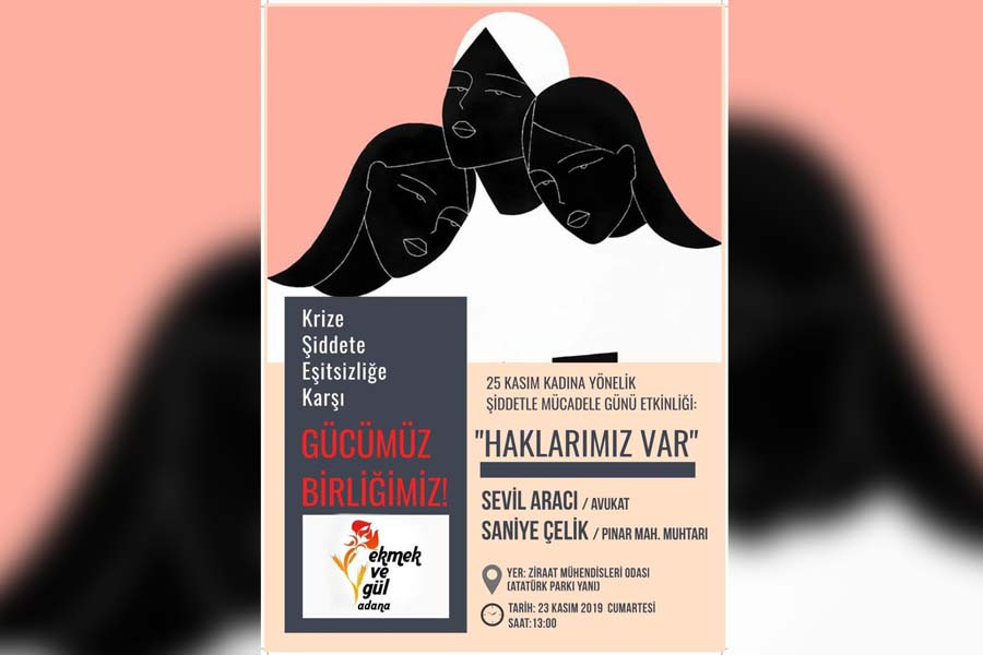 Adana Ekmek ve Gül Grubu, ‘Haklarımız var’ panelinde buluşacak. Konuşmacılar Avukat Sevil Aracı ve Pınar Mahallesi Muhtarı Saniye Çelik olacak.