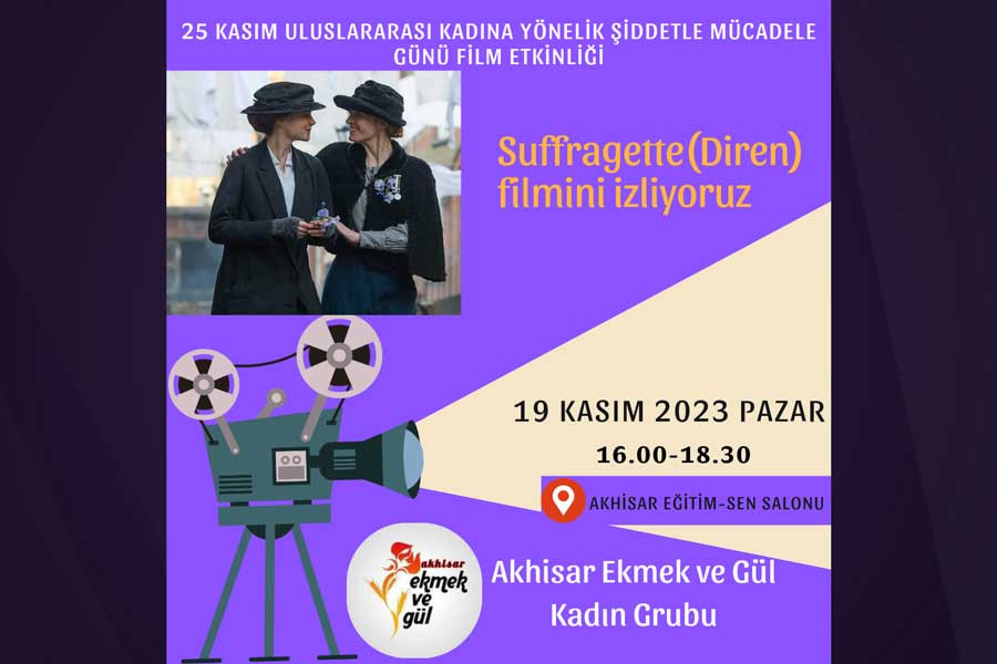 Akhisar Ekmek ve Gül Grubu 25 Kasım Kadına Yönelik Şiddete Karşı Uluslararası Mücadele ve Dayanışma Günü’ne giderken Suffragette (Diren) filmini izlemek için buluşuyor.