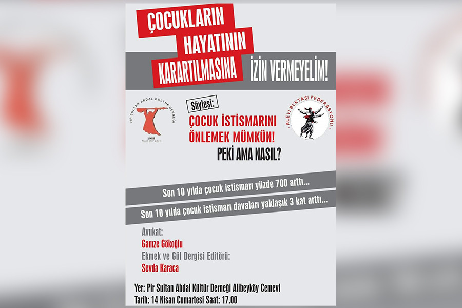 14 Nisan Cumartesi günü Pir Sultan Abdal Kültür Derneği Alibeyköy Cemevinde düzenlenecek “Çocuk İstismarını Önlemek Mümkün, Peki Ama Nasıl?” başlıklı söyleşiye konuşmacı olarak Avukat Gamze Gökoğlu ve Ekmek ve Gül Editörü Sevda Karaca katılacak.
