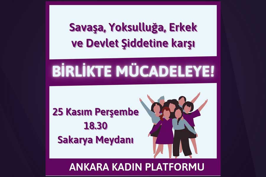 Ankara Kadın Platformu 25 Kasım’da ‘Savaşa, Yoksulluğa, Erkek Devlet Şiddetine Karşı Birlikte Mücadeleye!” sözüyle sokağa çıkıyor. 25 Kasım Perşembe, 18.30 , Sakarya Meydanı.
