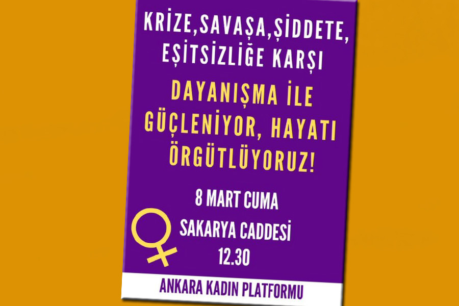 Ankara Kadın Platformunun çağrısıyla kadınlar, 8 Mart Cuma günü saat 12.30’da Sakarya Caddesinde yoksulluğa, güvencesizliğe, savaşa, kadın cinayetlerine, tacize, tecavüze karşı “Bir aradayız” diyecek.
