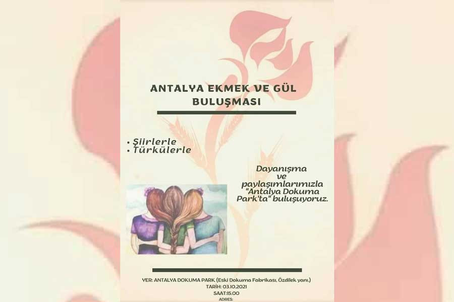 Antalya Ekmek ve Gül okurlarının düzenlediği etkinlikte kadınlar dayanışma ve paylaşımlarıyla 15.00’te Dokuma Park’ta olacak.