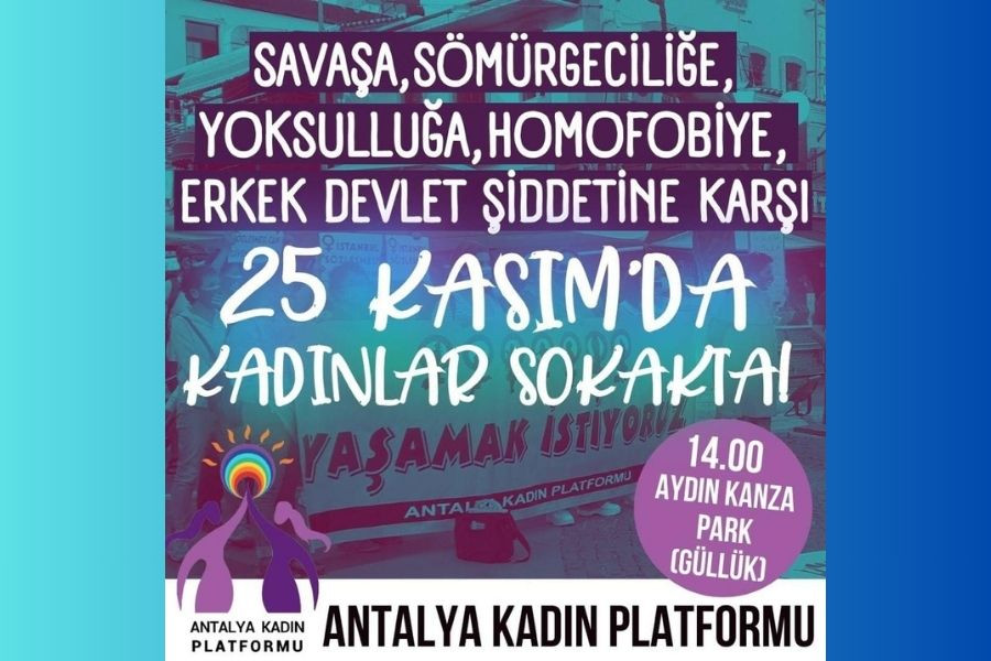 Antalya Kadın Platformu, savaşa, sömürgeciliğe, yoksulluğa, homofobiye, erkek devlet şiddetine karşı 25 Kasım'da kadınları sokağa çağırıyor.
