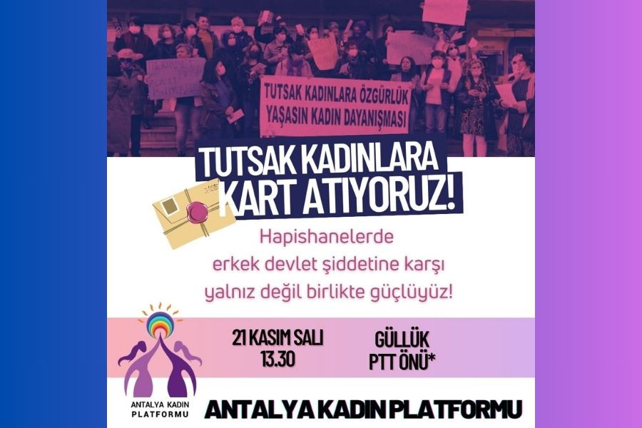 25 Kasım'a giderken Antalya Kadın Platformu'nun çağrısıyla kadınlar, "Hapishanelerde devlet şiddetine karşı yalnız değil birlikte güçlüyüz" diyerek tutsak kadınlara kart gönderecek.