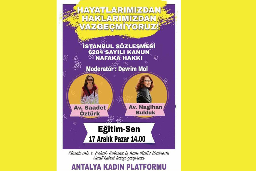 Antalya Kadın Platformu 17 Aralıkta Av.Saadet Öztürk ve Av.Nagihan Bulduk ile "İstanbul Sözleşmesi" ve "6284 Sayılı Kanun Nafaka Hakkı" konuşulacak.