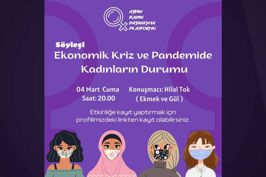 Aydın Kadın Dayanışma Platformu editörümüz Hilal Tok'un katılımıyla Ekonomik Kriz ve Pandemide Kadınların Durumu söyleşisine çağırıyor.