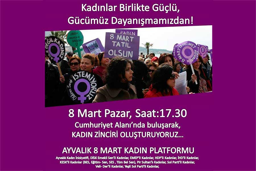 Ayvalık 8 Mart Kadın Platformu Ayvalık’taki kadınlara çağrı yaparak ‘8 Mart’ta Ayvalık Cumhuriyet Meydanı’nda buluşuyor, kadın zinciri oluştururyoruz’ dedi.