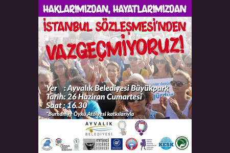 Balıkesir Ayvalık'tan kadınlar 26 Haziran Cumartesi 16.00'da Büyükpark'ta 'Haklarımızdan vazgeçmiyoruz' demeye çağırıyor.