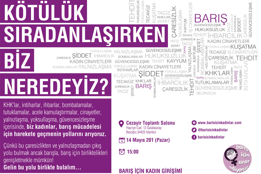 Barış İçin Kadın Girişimi kadınlara ‘Kötülük sıradanlaşırken biz neredeyiz?’ sorusu sorusunu soruyor ve kadınları sözü büyütmeye, barışı büyütmeye, yolu birlikte bulmaya çağırıyor.