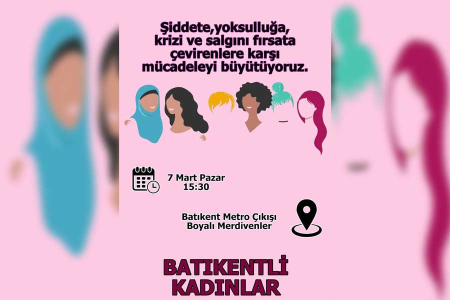 7 Mart Pazar günü 15.30’da Batıkent Metro çıkışı boyalı merdivenlerde buluşacak olan Batıkentli kadınlar 8 Mart Dünya Emekçi Kadınlar Günü öncesi talepleriyle, dayanışmasıyla, mücadelesiyle sokaklarda olacak.