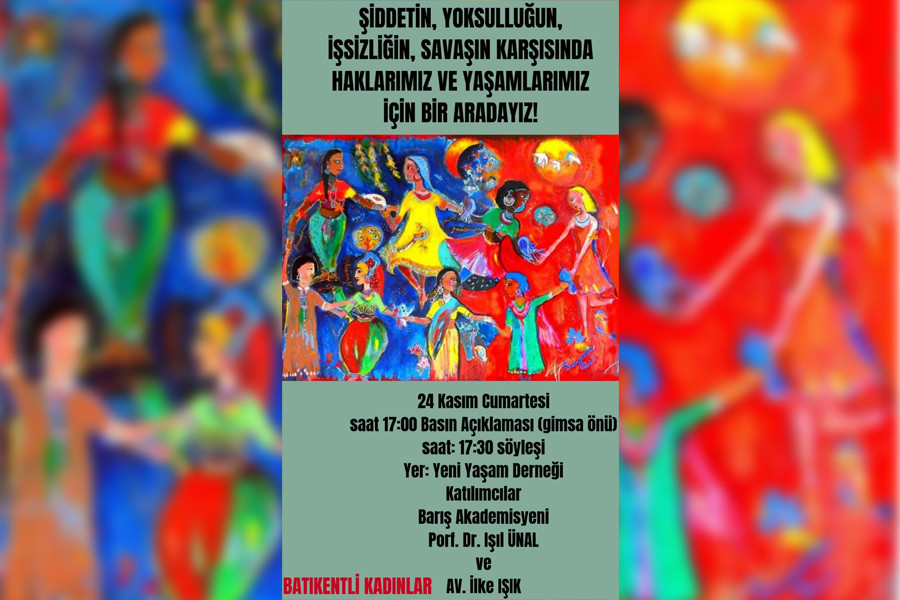 Ankara’da Batıkentli Kadınlar, 25 Kasım etkinliklerini, ‘Şiddetin, Yoksulluğun, İşsizliğin, Savaşın Karşısında Haklarımız ve Yaşamlarımız İçin Bir Aradayız’ şiarıyla düzenleyecek. 24 Kasım Cumartesi günü Batıkent GİMSA önünde yapılacak basın açıklamasının ardından kadınlar, söyleşide bir araya gelecek. Barış Akademisyeni Prof. Dr. Işıl Ünal ve Avukat İlke Işık’ın katılımıyla Yeni Yaşam Derneğinde bir araya gelecek kadınlar, bir arada olmaya ve şiddetin her türlüsüne karşı mücadele etmeye çağırıyor.