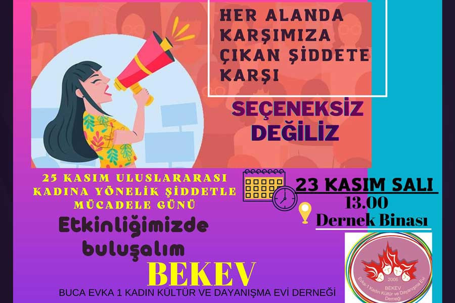 Her alanda karşımıza çıkan şiddete karşı seçeneksiz değiliz! Seçenek biz kadınlarız! diyen Buca Evka/1 Kadın Kültür ve Dayanışma Evi Derneği kadınları 25 Kasım etkinliğine çağırıyor.