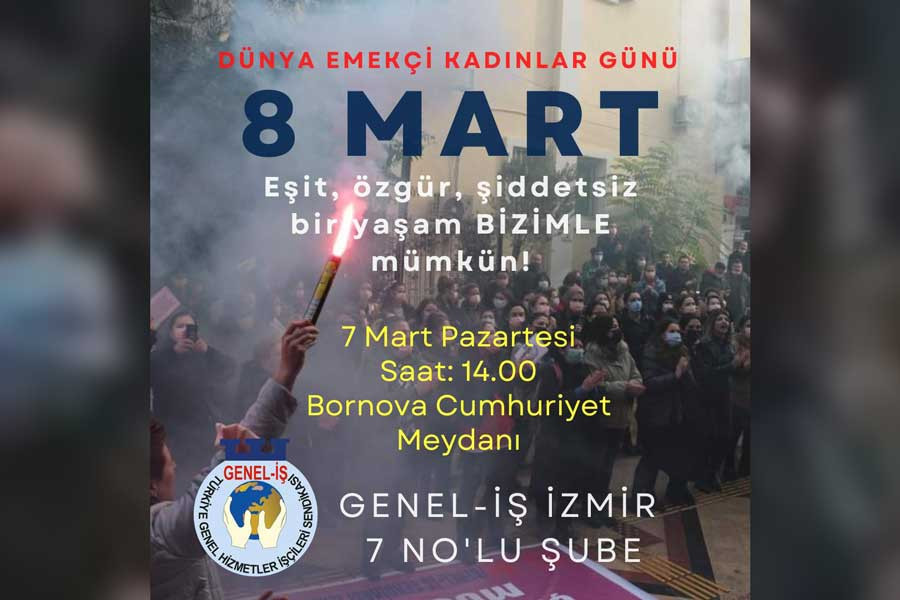 Genel-İş İzmir 7 No’lu Şube üyesi işçi kadınlarla ‘Eşit, özgür, şiddetsiz bir yaşam bizimle mümkün’ diyor 8 Mart açıklaması yapıyor.