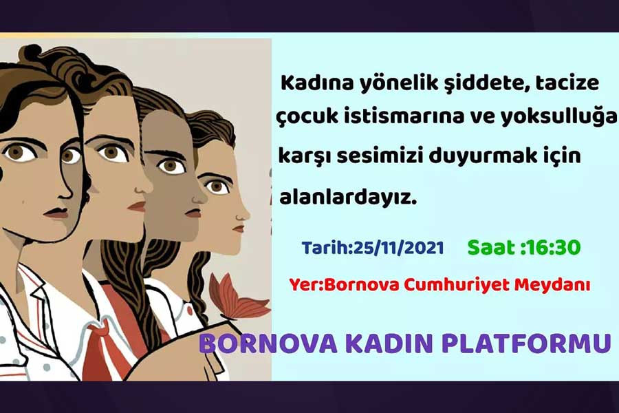 Bornova Kadın Platformu, ‘Kadına yönelik şiddete, tacize, çocuk istismarına ve yoksulluğa karşı sesimizi duyurmak için 25 Kasım’da alanlardayız’ diyor.