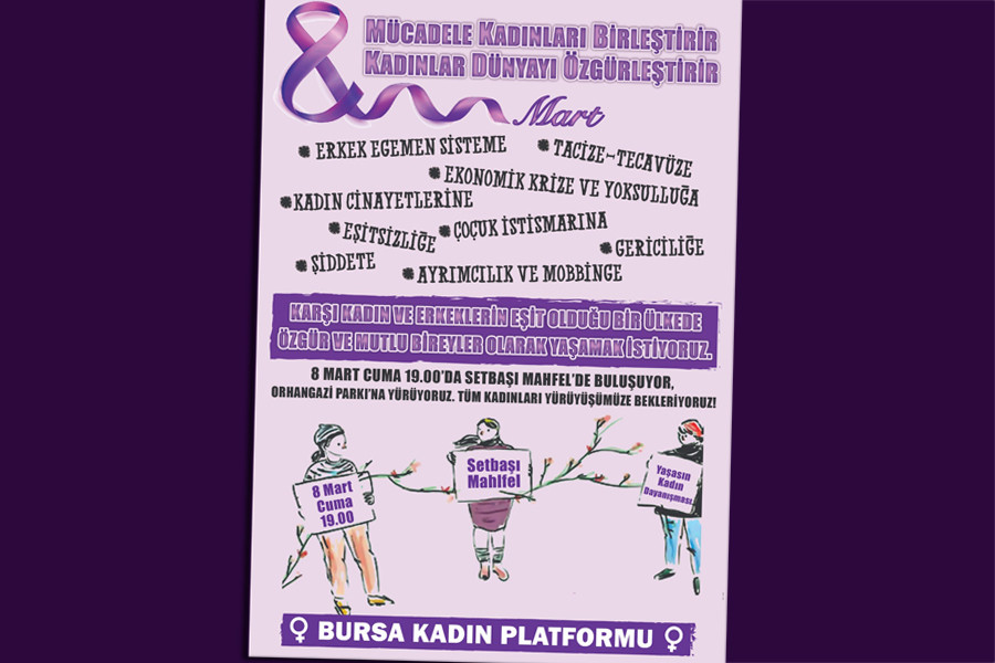 “Bugün kazandığımız haklara karşı saldırıların arttığı bir dönemden geçiyoruz” diyen Aysun Torun, açıklamasını şöyle sürdürdü:“Kadın cinayetleri, şiddet, taciz, tecavüz haberleri ile anılmaktan bıktık. Kadın katillerinin iyi hal indirimleri ile aramızda dolaşmasını istemiyoruz. Nafaka hakkımız gibi tüm kazanımlarımızın bir bir kaybettirilmeye çalışılmasına seyirci kalmayacağız. Çocuklarımızın cinsel, fiziksel istismara uğramadığı bir ülkede yaşamasını istiyoruz. Ekonomik krizin yükünü en çok biz kadınlar çekiyoruz. Yoksulluğun kadınların kaderi olmadığı bir ülkede ve dünyada insanca bir yaşam istiyoruz. Kadına yönelik ayrımcılık ve bunun uzantısı şiddet, insan hakları ihlalidir; münferit değil, sistematiktir. Ailenin mahremiyeti, aile içinde olup biten, özel alana ait, hukuk denetimi dışında kalan aile içi bir mesele değildir. Bu nedenle, engellenmesi de ancak sistemli ve etkin bir mücadele ile gerçekleşebilir. Kadına ve çocuğa yönelik şiddetle mücadele için imzalanan İstanbul Sözleşmesi ile 6284 sayılı yasa tam olarak uygulanmalıdır. Erkek egemen kapitalizmin yarattığı yoksulluğu, işsizliği, ayrımcılığı, eşitsizliği, cinsiyetçiliği, gericiliği, şiddetin her türlüsünü, savaşı ve militarizmi en ağır biçimleriyle yaşıyoruz. Bugün mücadele ‘Neden’lerimiz çok daha katmerli duruma getirilmiş durumda. Ama biz kadınlar da bugün tarihimizden öğrendiklerimizle, artan mücadele ruhumuzla daha örgütlü ve daha güçlüyüz. Bursa Kadın Platformu olarak tüm kadınları, bizden çalınanları geri almak, haklarımıza sahip çıkmak ve mücadelemizi hep birlikte yükseltmek için 8 Mart Cuma akşamı saat 18.30’da Setbaşı Mahfel’de toplanıp Orhangazi Parkı’na yürümeye davet ediyoruz.”