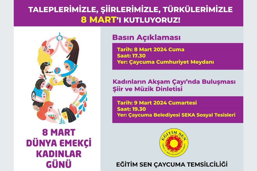 Çaycuma'da kadınlar Eğitim-Sen'in çağrısıyla 8 Mart'ta basın açıklamasında, 9 Mart'ta akşam çayında buluşuyor!