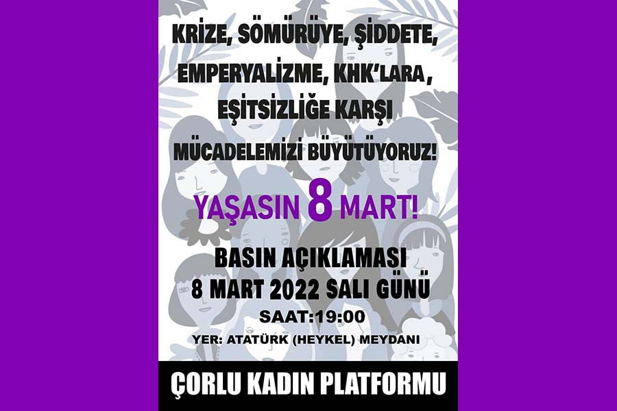 Çorlu Kadın Platformu kadınları 8 Mart saat 19.00'da krize, sömürüye, emperyalizme, KHK'lara, eşitsizliğe karşı ses çıkartmaya Atatürk Heykel Meydanı'na çağırıyor.