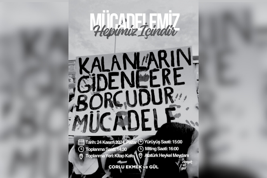 Çorlu Ekmek ve Gül, 'Mücadelemiz hepimiz içindir' şiarıyla 25 Kasım Uluslararası Kadına Yönelik Şiddetle Mücadele ve Dayanışma Günü için miting düzenliyor. Çorlu'lu kadınlar kadına yönelik şiddete, kadın ve çocuk cinayetlerine, çocuk istismarına karşı tüm kadınları mitinge çağırıyor!