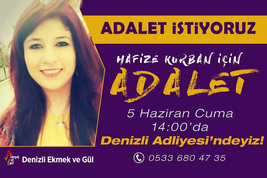 Denizli’nin Pamukkale ilçesinde geçtiğimiz yıl ayrılmak istediği erkek tarafından katledilen Hafize Kurban’ın cinayet davası 5 Haziran’da (yarın) görülecek. Denizli Ekmek ve Gül Grubu, kadınları eşi tarafından katledilen Hafize Kurban’ın davasına sahip çıkmaya çağırıyor.