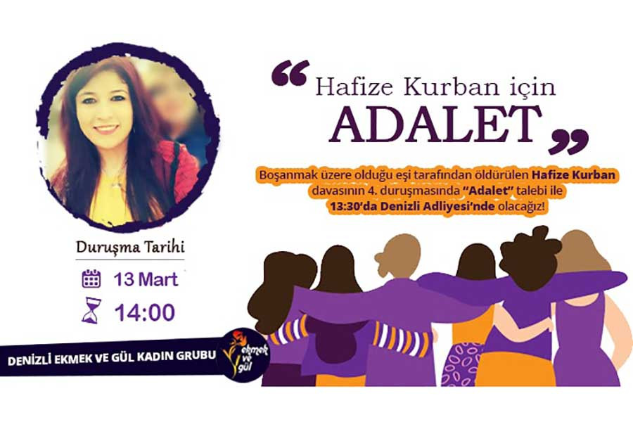 Denizli’nin Pamukkale ilçesinde geçtiğimiz aylarda eşi tarafından katledilen Hafize Kurban davasının 4. duruşması 13 Mart’ta yapılacak. Denizli Ekmek ve Gül Kadın Grubu, kadınları eşi tarafından katledilen Hafize Kurban’ın davasına sahip çıkmaya çağırıyor.