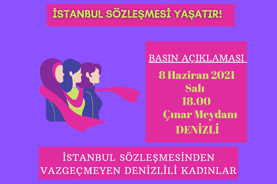 Denizlili kadınlar "Hayatlarımız, haklarımız ve #İSTANBULSÖZLEŞMESİBİZİM!" diyerek 8 Haziran Salı 18.00'de Çınar Meydanı'nda buluşma çağrısı yapıyor.