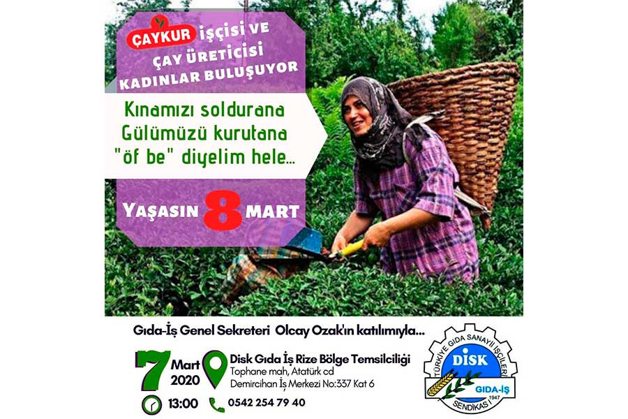 Gıda-İş Genel Sekreteri Olcay Ozak’ın katılacağı etkinlikte, ÇAYKUR işçisi ve çay üreticisi kadınlar sorunlarını, taleplerini, çözüm önerilerini konuşacak.