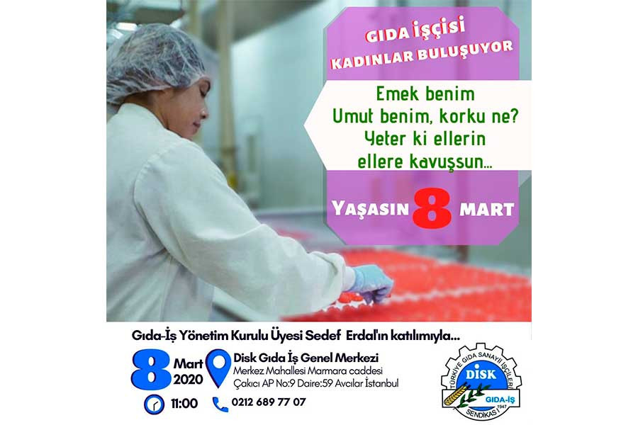 Gıda-İş Yönetim Kurulu Üyesi Sedef Erdal’ın katılımıyla yapılacak etkinlikte gıda işçisi kadınların sorunları konuşulacak.