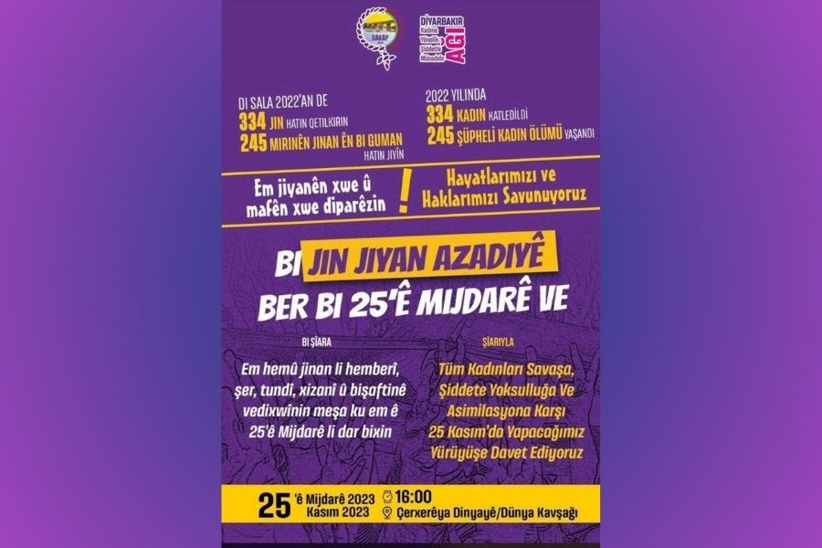 Diyarbakır Kadına Yönelik Şiddetle Mücadele Ağı 25 Kasım'da kadınları savaşa, şiddete ve yoksulluğa karşı sokağa çağırıyor.