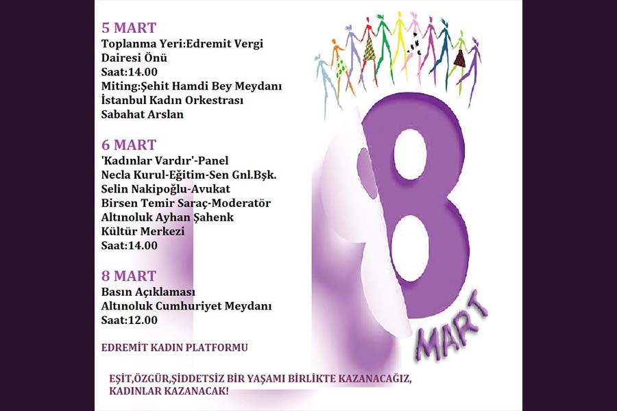 Edremit Vergi Dairesi önünde toplanıp, Şehit Hamdi Bey Meydanı'nda İstanbul Kadın Orkestrası ve Sabahat Arslan'ın katılımıyla gerçekleşecek mitinge geçilecek.
